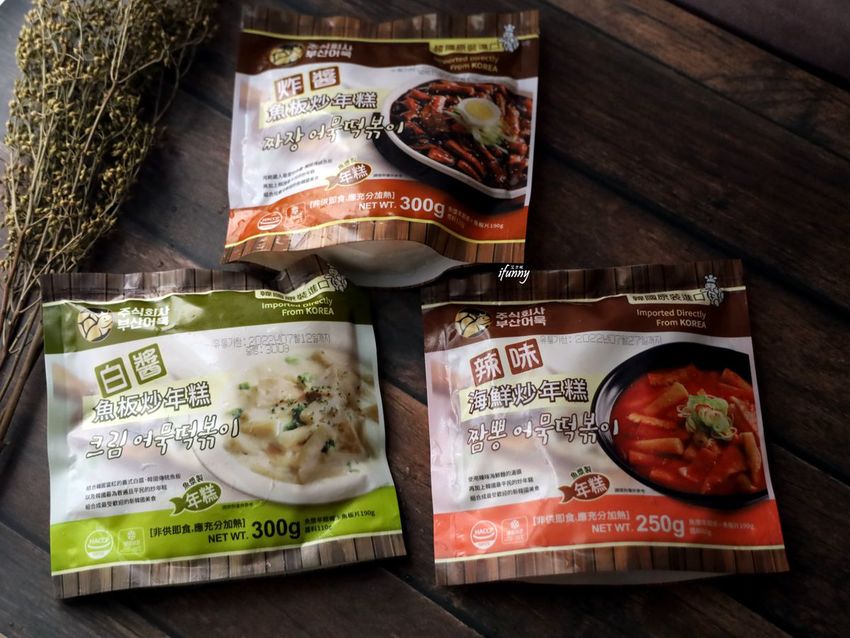 每包魚板炒年糕打開後,主要食材就是年糕及魚板兩種,另外附上的就是特製的醬料包。