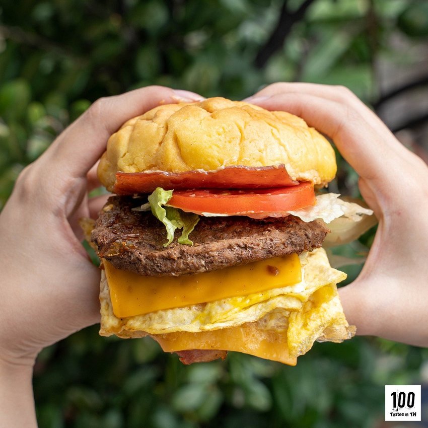 牛肉漢堡排、培根、火腿、番茄、生菜、雙起司、嫩蛋等豐富內餡,並涮上味道鹹香的烤肉醬,意圖使人無法一手掌握啊!