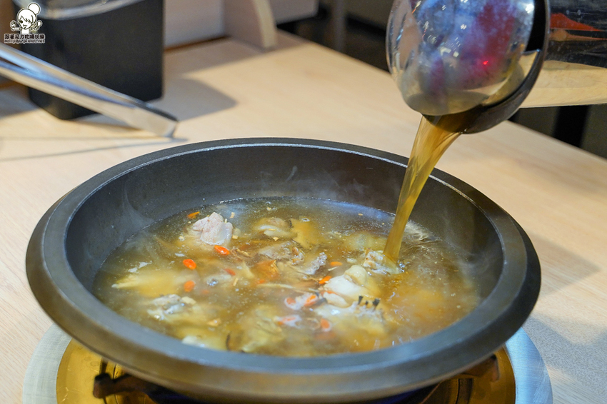 倒入獨門熬煮的燒酒雞專屬湯頭提味,帶出藥膳香氣