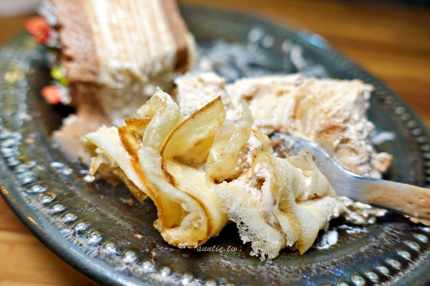 上頭是像蒙布朗蛋糕的細細栗子泥,還加了點果乾,千層蛋糕口感很細緻,千層蛋糕皮做的好薄,甜度也不會太甜,奶油部分也好好吃!