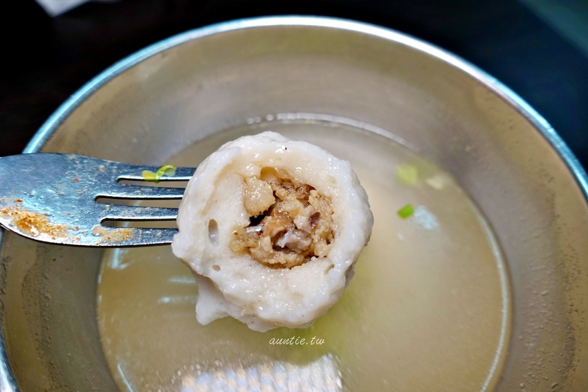 老闆把叉子很結實的插在肉圓上,裡頭的肉餡真的頗大塊,還加了筍塊,後來發現居然還有滷過的鵪鶉蛋,真的蠻特別的!肉肉圓醬汁是甜甜鹹鹹的,完全是個人愛的那種醬汁,肉圓外皮有夠Q彈,雖然評價有些人說有肉腥味,不過個人覺得還好耶,腥味吃不太出來,不過筍子可以再加多一點會更好!