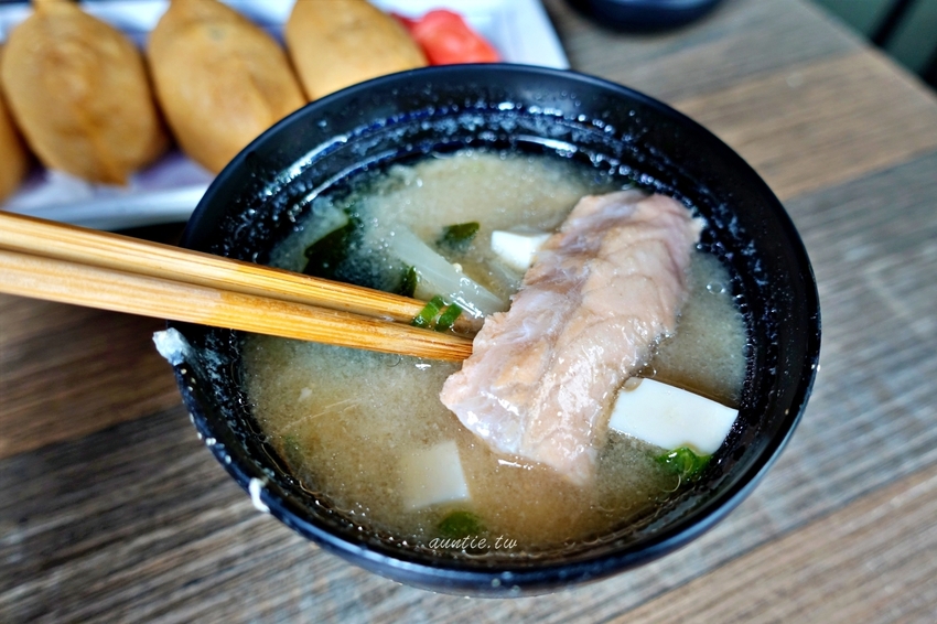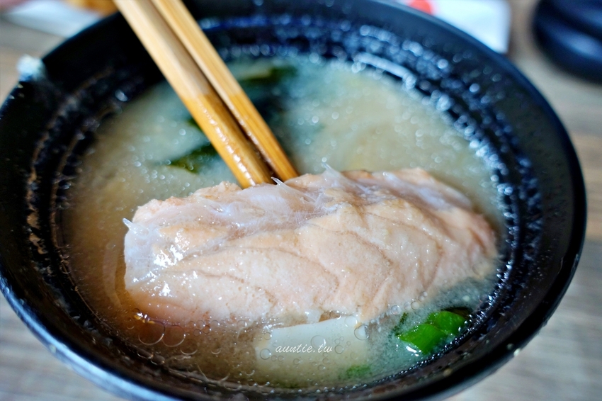 味增魚湯跟茶飲是可以無限續的喔,味增魚湯裡頭的鮭魚挺大塊的,還有很多洋蔥跟豆腐,味道不錯只是喝多有點鹹。