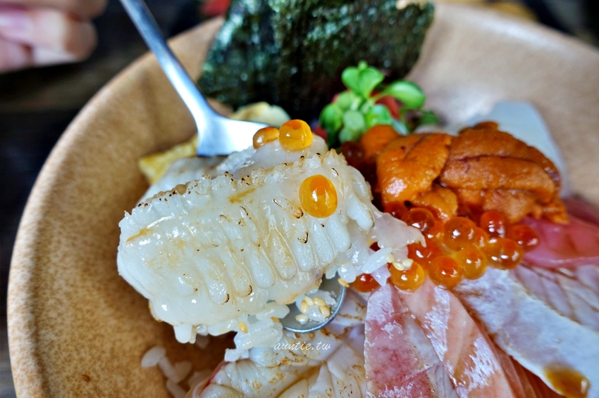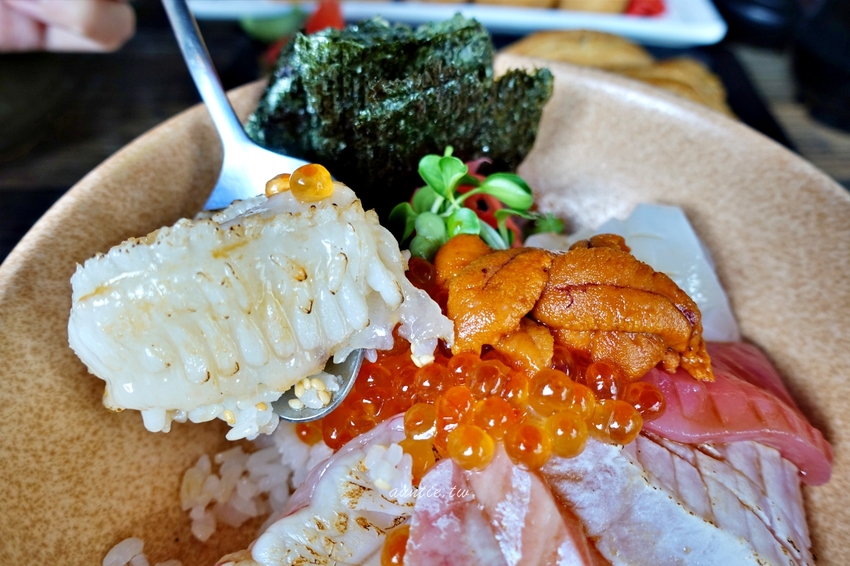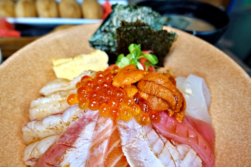 北海道海鮮丼裡有鮭魚卵、海膽、甜蝦、生魚片,個人覺得北海道海鮮丼比較好吃,可能多了比目魚鰭邊肉,還有炙燒過的厚厚生魚片,香氣比較夠,尤其是比目魚鰭邊肉,油脂豐富,炙燒過後很好吃,個人很愛。甜蝦也是很新鮮,彈牙又有甜味,好吃!