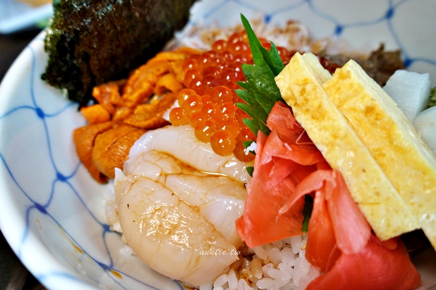 左邊的是北海道五色丼包含干貝、海膽、鮭魚卵、松葉蟹肉、蟹膏,其實海鮮們都很新鮮,海膽沒有什麼腥味,松葉蟹膏跟蟹肉味道口感都很細緻,就是青啦!不過同樣的就是醋飯部分有點乾嚕!