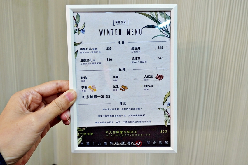 阿富豆花店面小小的,有內用的位子不過也不多 ,環境很乾淨,冬季菜單有豆花、燒仙草跟紅豆湯。