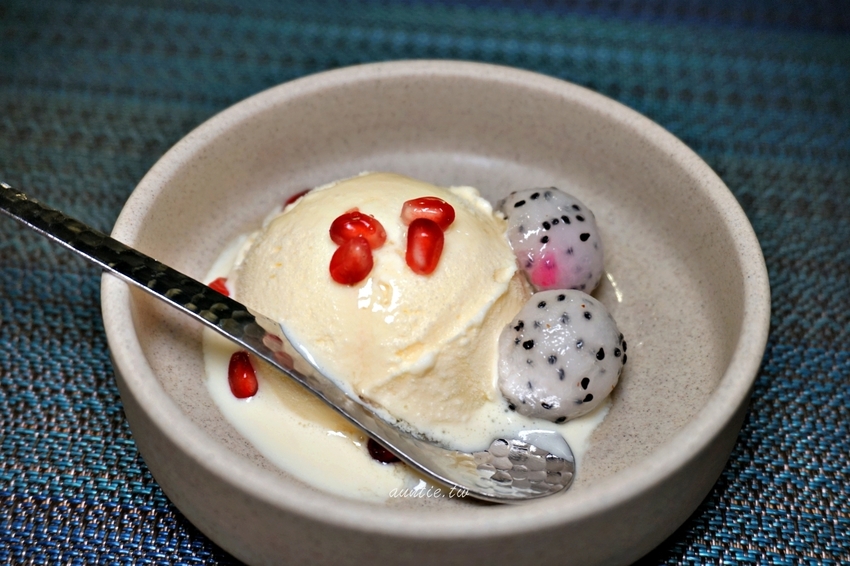 香草冰淇淋淋上接骨木糖漿,以及石榴籽,吃起來多了接骨木淡淡的又不搶戲的香氣,搭配新鮮火龍果,雖然已經飽到頭頂了,但是甜點是另外一個胃。