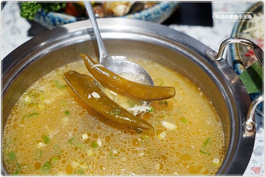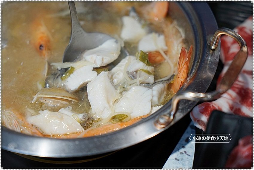 鱸魚+海白蝦+蛤蠣,一個人這樣吃不單單很超值也很飽足!! 海鮮盤上有附上一小瓶米酒、這是在煮海鮮時可以加入一點提鮮味唷!! 但也依照個人喜愛,小凉覺得加米酒後的剝皮辣椒湯更好喝!