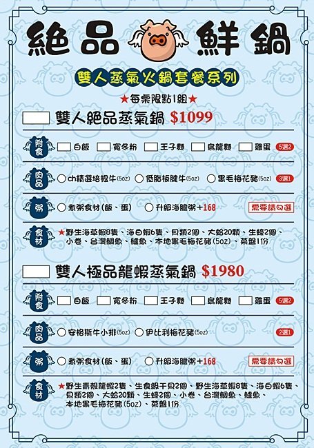 雙人蒸氣火鍋套餐系列,這雙人蒸氣火鍋點的人真的不少,可以吃到海鮮最原始的鮮甜、又可以吃到暖暖的鍋物真的很棒!
