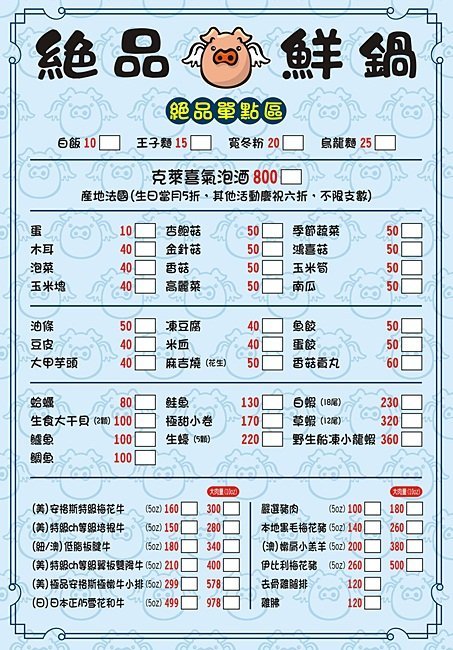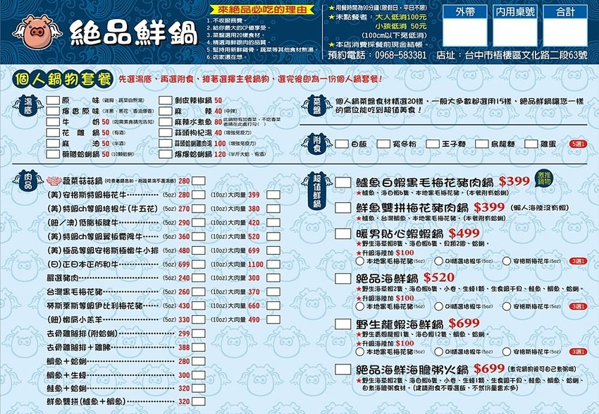絕品鮮鍋菜單–個人鍋物套餐,先選湯底→再選附食→主餐鍋物,多人用餐也可以直接選雙人或四人套餐! 店內不收服務費、平日不限時、假日限時90分鐘,未點餐者大人低消$100、小孩$50(100cm以下免低消),收費方式為餐前現金結帳。