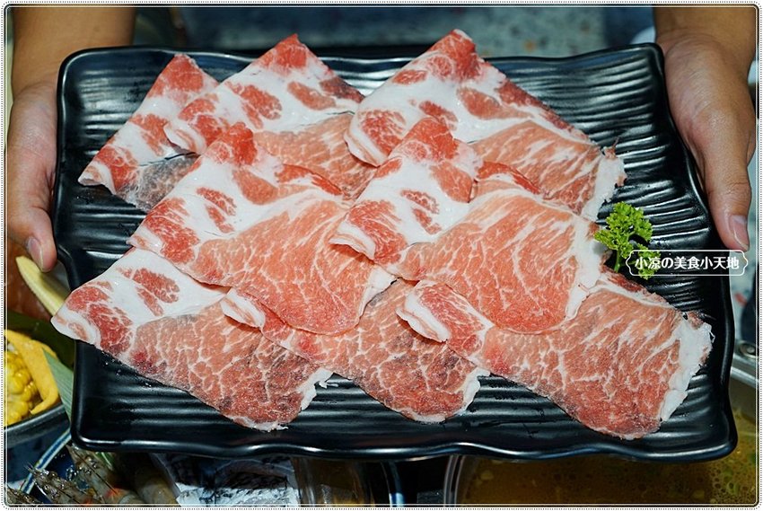 雙人絕品海陸鍋–本地黑毛梅花豬(5oz),色澤紅白鮮明、油花分布均勻,令人期待美味!