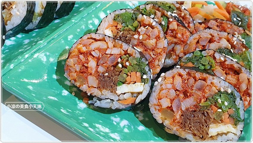 紅咚咚的飯捲看起來就好誘人,飯捲的米飯不軟爛吃起來是有彈性的!! 海苔內包覆了辣豬肉、胡蘿蔔、煎蛋、牛蒡絲、菠菜等等,一入嘴的口感層次鮮明。好滿足唷!!! 帶著微辣的風味更是涮嘴!!
