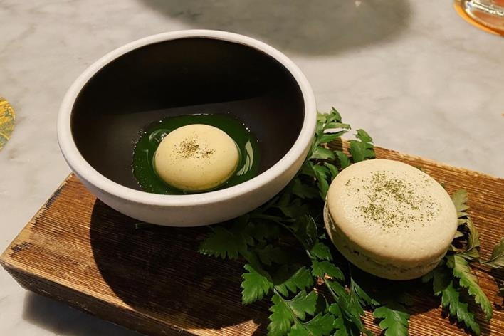 主廚剛到台灣時曾去屏東原住民餐廳打工,學習到刺蔥是原住民餐點中很重要的香料之後轉用在本季的甜點中。 刺蔥馬卡龍,白巧克力冰和刺蔥醬。 第一次吃到刺蔥,感覺跟香椿香菜之類的很像,只是吃起來多了些清涼感,主要還是甜味居多。