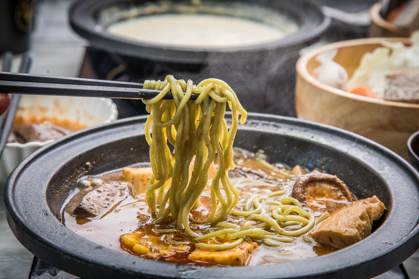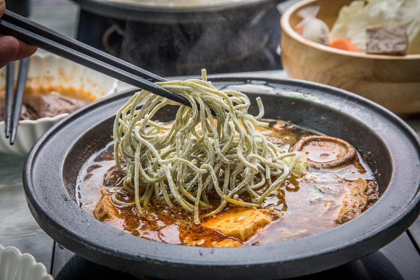 手工蔬菜麵可以加在麻辣鍋湯裡煮,蔬菜麵口感滑溜,加上麻辣鍋底微微辣度及香氣,就算剛剛吃到飽飽的,蔬菜麵一樣吃光光!