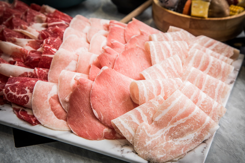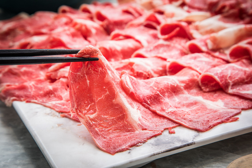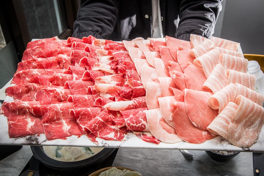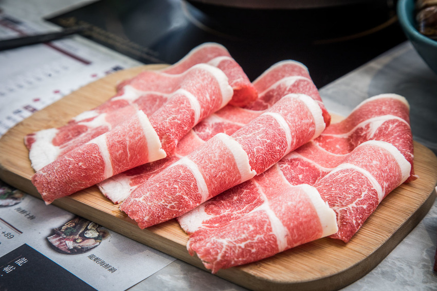 安格斯低脂牛,幾乎全是瘦肉不帶筋油脂肪,口感較為緊實有彈性,低脂牛涮麻辣鍋底也相當好吃