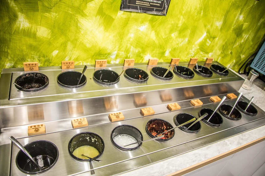 嗑肉石鍋-桃園八德店的自助區,各式醬料一字排開,除了一般台式常見的辣椒、蒜泥、沙茶、蔥、醬油等等,嗑肉石鍋還擁有不少自己獨家的醬汁呦!還有日式胡麻醬、橄欖油蔥油醬、紫蘇梅醬油等等獨門醬料