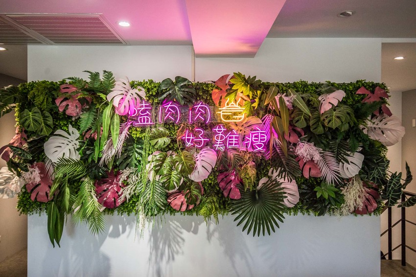二樓則是有點網美風格,一大面花牆上面有『嗑肉肉好難瘦』的LED燈,除了大桌區外,二樓還有『景觀第一排』的面窗座位,邊吃火鍋還可以欣賞外面的綠意街景,值得一提的是嗑肉石鍋-桃園八德店的桌面是大理石紋,即使是平價鍋物,嗑肉石鍋也要給你滿滿的高級感