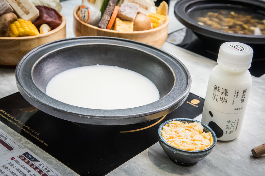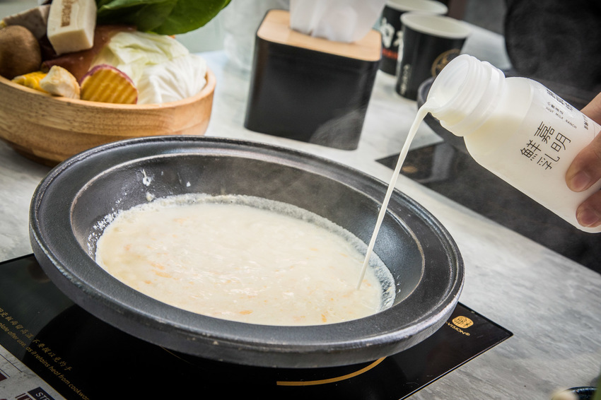 起司牛奶湯底,起司牛奶湯可厲害了,除了整鍋都是牛奶外,裡面還放了起司增加湯頭的厚度,而且加湯也沒在客氣,加湯也是加牛奶湯底,光喝湯就值了!女孩們超喜歡這款湯底的