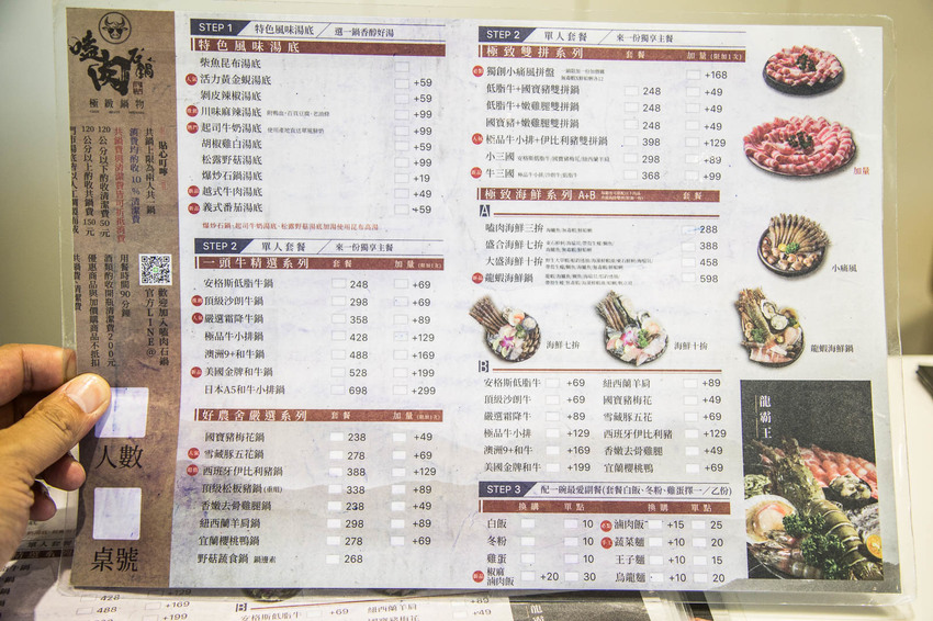 鍋底有八種選擇,除了柴魚昆布湯底不用加價外,其他都要加價,推薦活力黃金蜆湯底跟川味麻辣鍋底,鍋底加湯也都是原湯,光喝湯就值了,除了一般菜單選項外,還推出了『王』字輩的精選菜單,食材等級較高,包括和牛、龍蝦等等,主打大份量的頂級食材個人鍋物