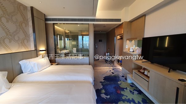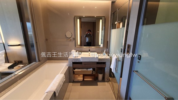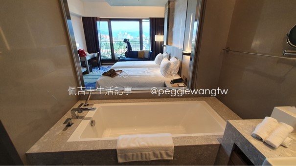 本次入住豪華客房兩人房(含早餐),床具是安珂絲Arcenciel雲棉枕芯及柔纖被(好想買一套)、拉簾式蚊帳,備品包含天森無患dp馬鞭草沐浴組、免費盥洗用品、拖鞋、免費Evian礦泉水、免費MINI BAR與兄弟飯店鳳梨酥茶點,TOTO免治馬桶、浴缸、乾濕分離淋浴間、Panasonic摺疊吹風機…..是不是感覺好棒棒、應該好好享受~~