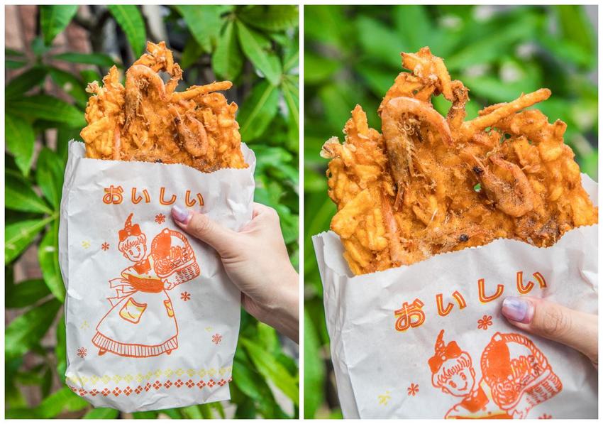 炸蝦餅,尺寸真的大,比151臉還大,剛炸好超酥脆的,蕃薯吃起來酥脆香甜,蝦子經過油炸香氣逼人,這家蝦餅不油膩,吃完紙袋也不會油油的,清爽好吃