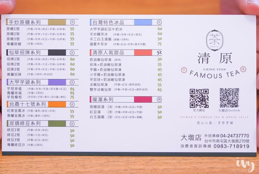 清原芋圓飲品選用多元,多種以九份芋圓、大甲芋頭、仙草等清原特有的手搖飲和冰品,另外還有原味茗茶、鮮奶、手炒黑糖、黑木耳、鮮果飲系列飲品,價格落在$25~$75元,第一次來到清原芋圓的你們,不知道要喝什麼,不妨選擇夯爆IG打卡版面的紫芋波波沙、芋見珍珠或是夏天必吃的大甲芋頭牛奶冰。