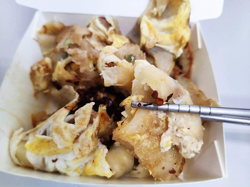 它的做法不是一次加兩顆蛋下去,而是先加一顆蛋液在第一面餅皮上,成形之後換面煎時再放入第二顆蛋液,所以餅皮的兩面都可吃到蛋的口感呀!