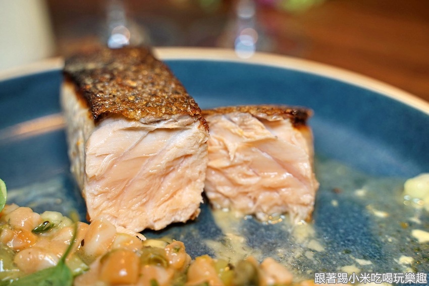 看這鮭魚排的厚度及酥脆而無焦感的鮭魚皮,就知道火侯的控制相當了得!