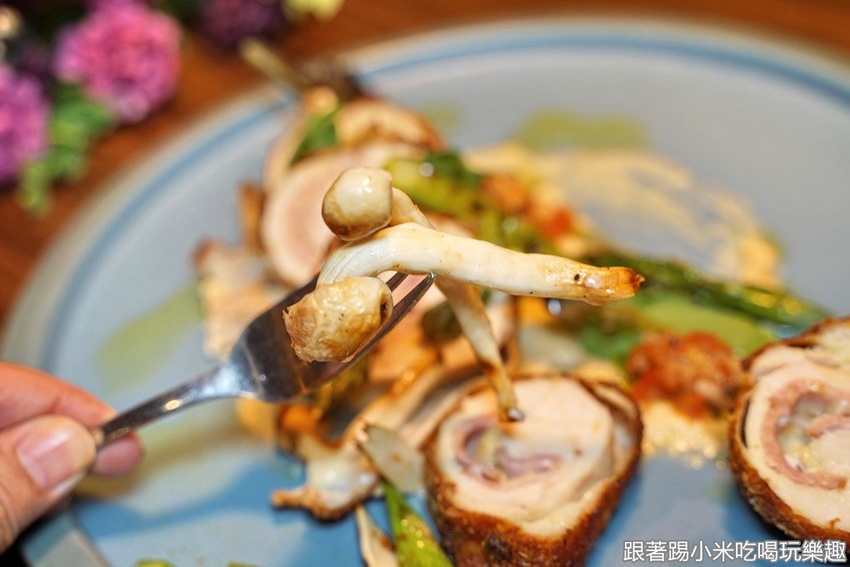 法式藍帶雞肉捲(450元),是法式的一道手工料理,雞腿肉去骨後再加上火腿乳酪等去做烤製,烤的火侯一樣掌控非常好,外皮烤到脆皮的口感,裡面雞肉嫩嫩的,還有起司及火腿的鹹香,沾著甜甜的醬汁來吃挺不錯的