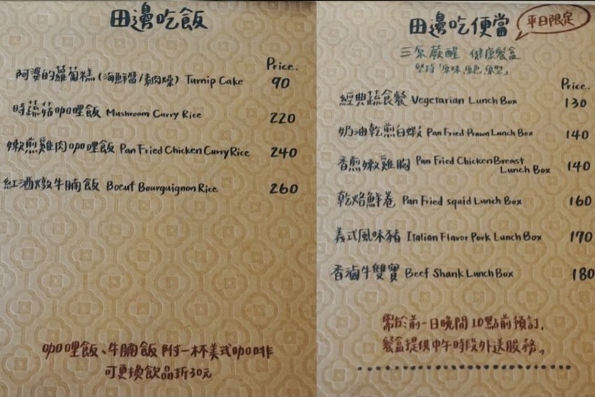 店內販賣的品項雖然簡單但也是一應具全,主推的有咖哩飯、咖啡飲品及手作甜點,平日還有供應相對平價的健康餐盒
