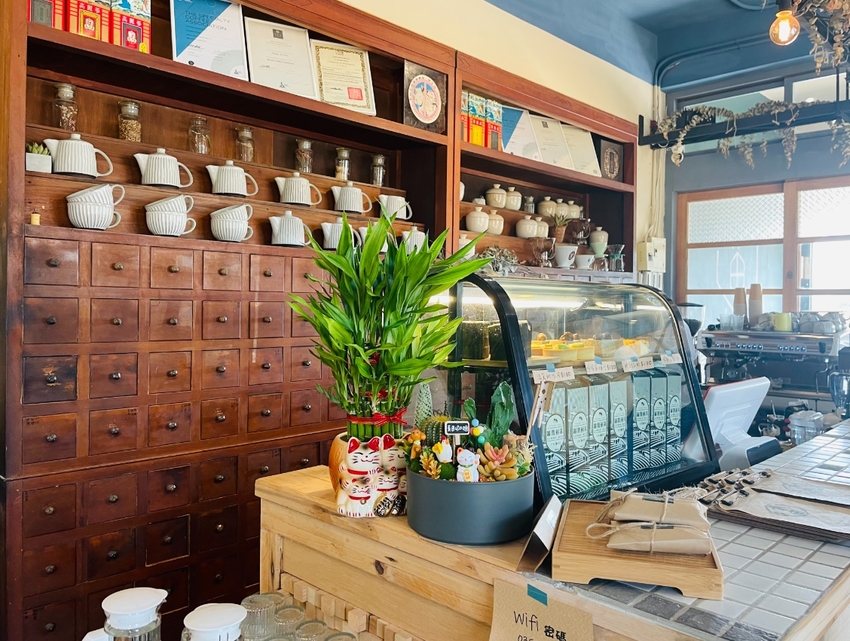 從裝潢擺設甚至式座椅,都能看得出是老宅改建的復古風格,然而其中最讓我無法忽略的,便是店員身後那搶眼的中藥櫃