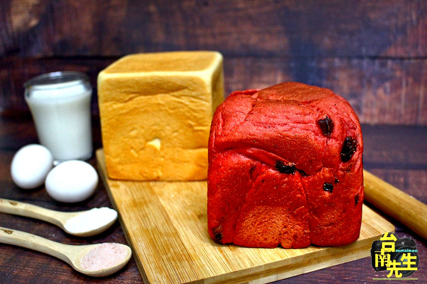 草莓生吐司:使用紅麴粉做出鮮紅色彩,無色素與其他化學添加物,裡頭加入些許天然草莓乾,營養價值高還吃得到濃郁果香
