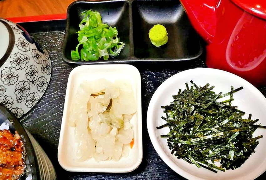 首先上桌的是名古屋鰻魚三吃朝盤套餐,除了鰻魚外. 一旁附有湯品、海苔絲. 醃漬小菜.蔥花.芥末.高湯.飯食等,也有準備飯勺與空碗備用!