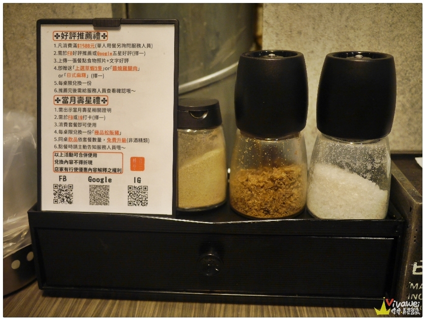 ▲座位旁邊放著餐具和醬料供自取,分別是椒鹽、煙燻鹽和海鹽!
