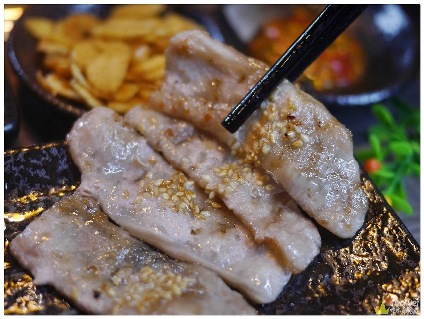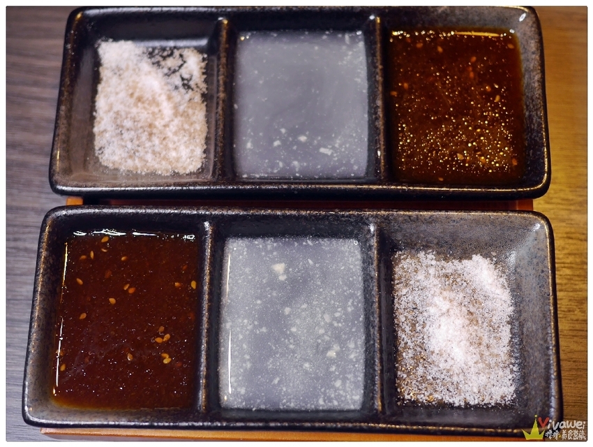 ▲醬料碟有三格,裡面放著燒肉醬和檸檬汁,還會有一格空著沒放醬料,可以將剛剛提到的海鹽、醃燻鹽、椒鹽依個人喜好加入其中!
