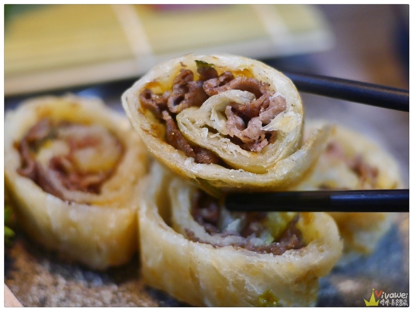 ▲和牛手作捲餅是店家的招牌,捲餅加了椒鹽和芥末在裡面,餅皮很Q彈有嚼勁!