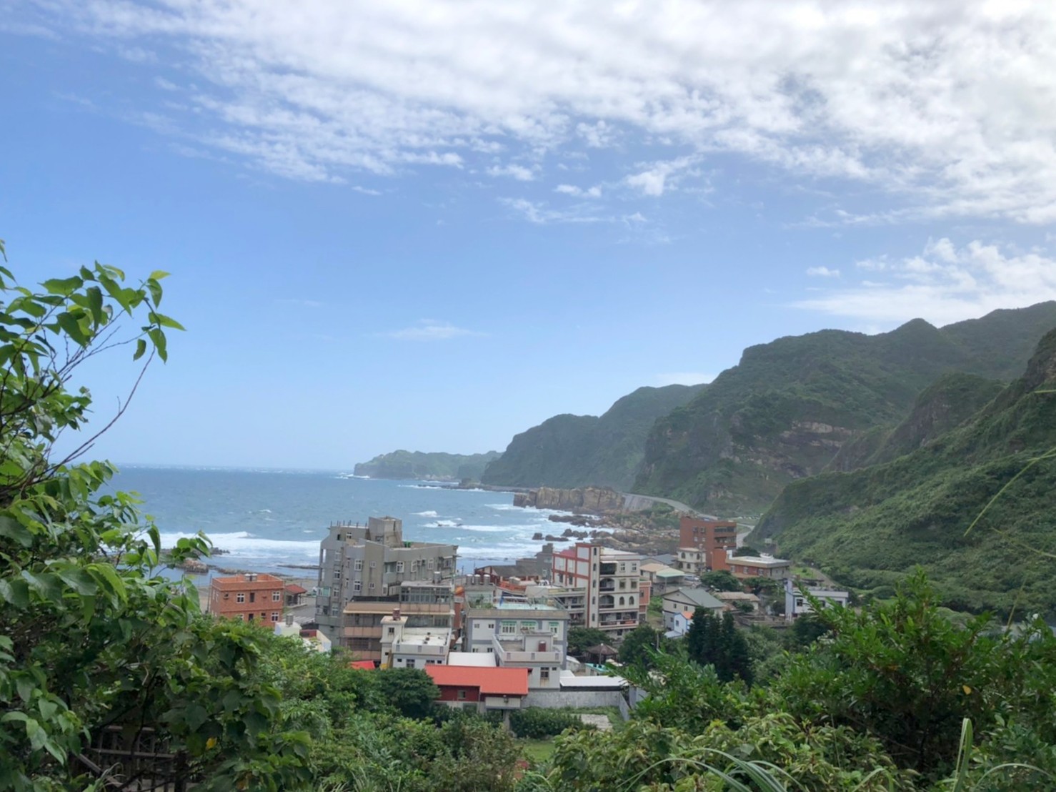 在藍天白雲和海灣、山巒疊起的陪襯下,山上的景緻