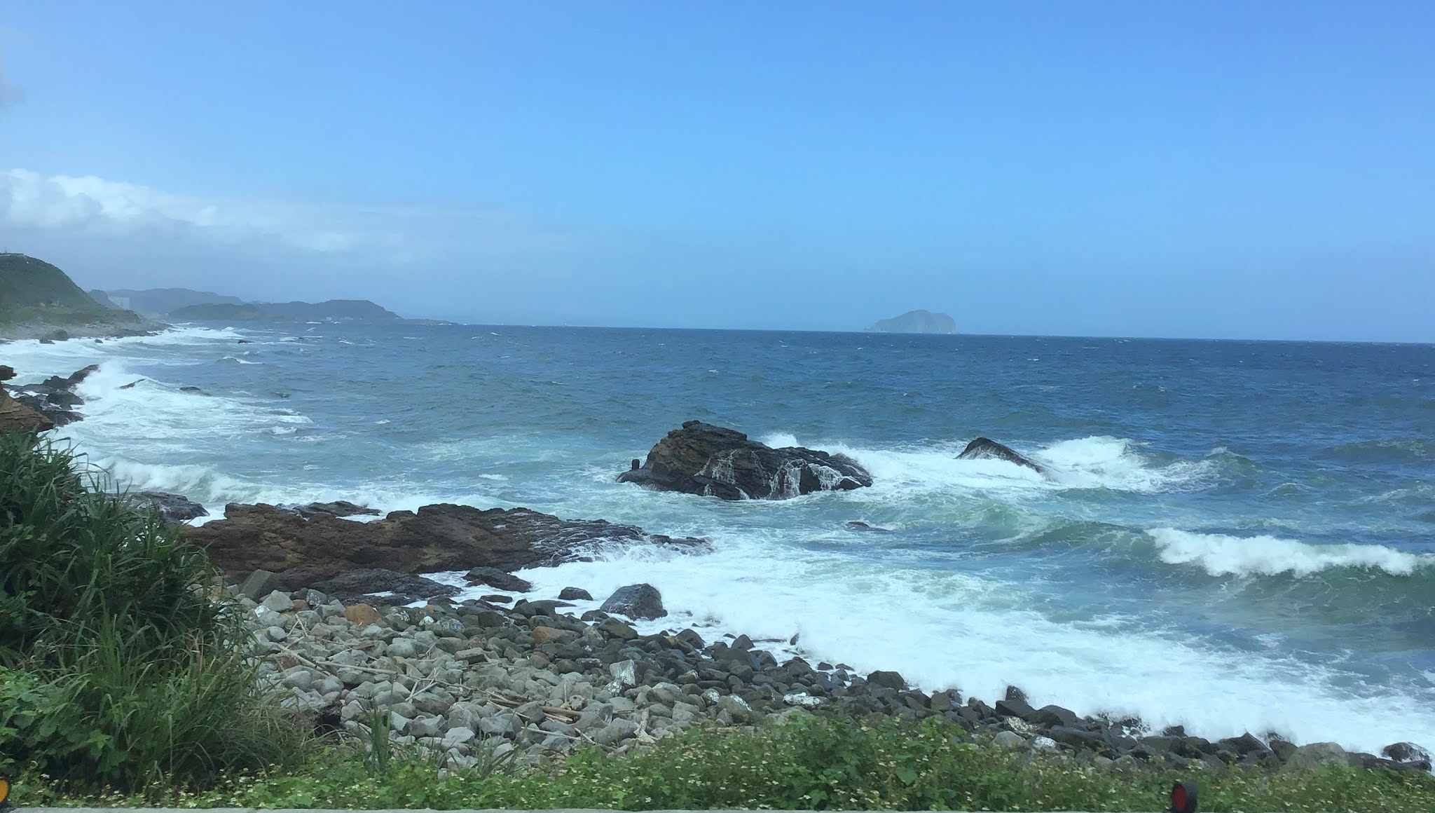 在遊覽車上看著湛藍的大海,漸次地迭起的山巒,