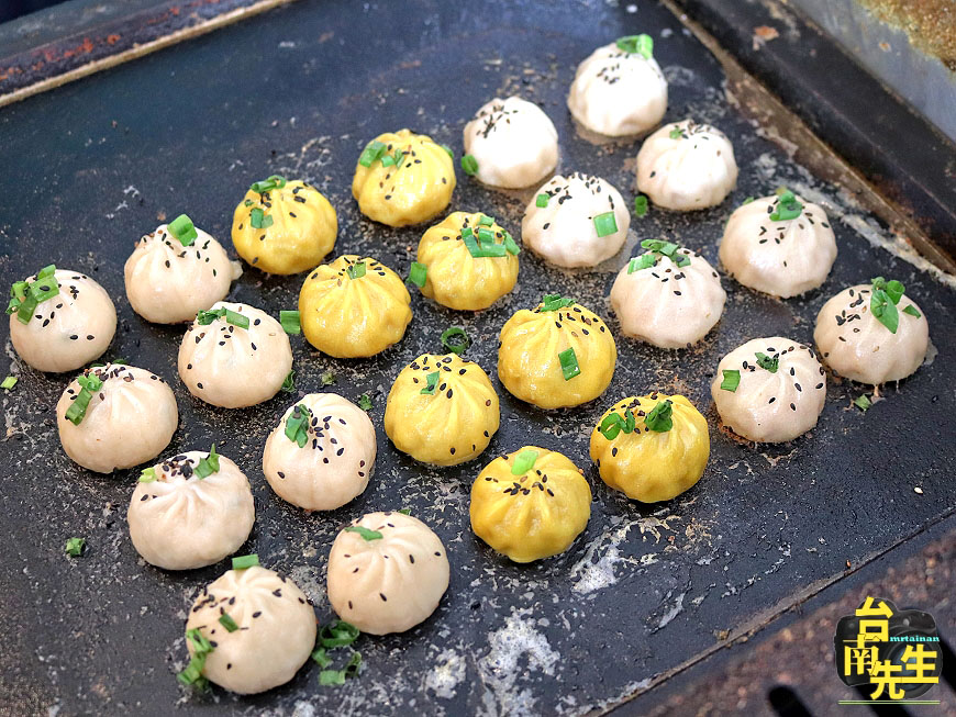 生煎包現點現煎,表皮灑上黑芝麻與蔥花,每份8顆
