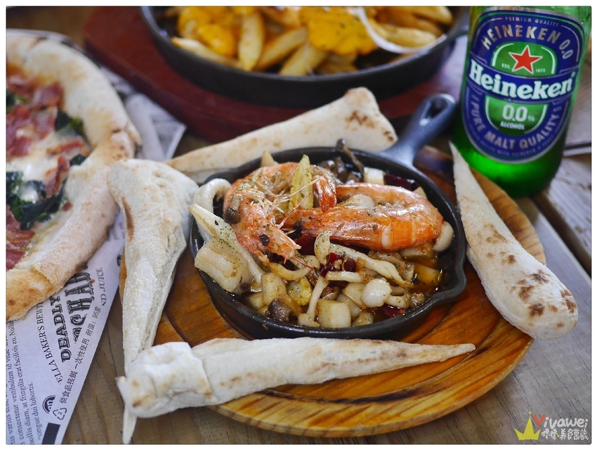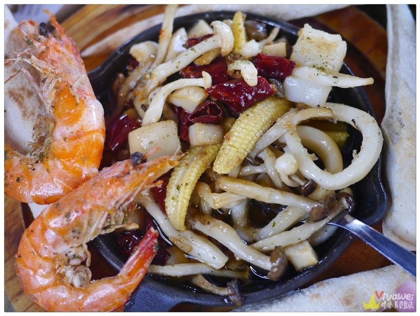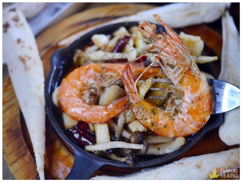 ▲這道鐵板油封海鮮是店家非常熱賣的招牌開胃菜!用煸過香草和蒜頭的特製橄欖油~炒了鯷魚、玉米筍和綜合菇類!旁邊附的佛卡夏麵包,可以沾著橄欖油一起吃!