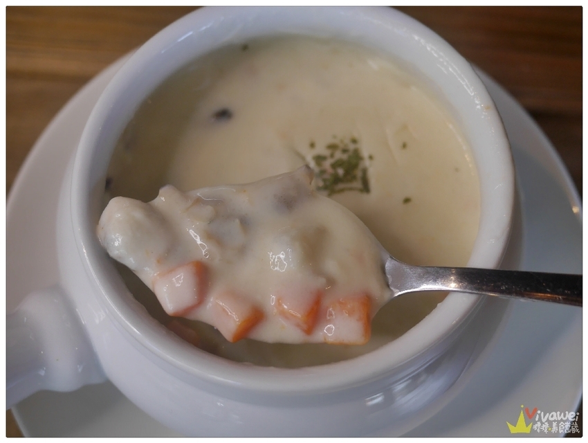 ▲點排餐均附濃湯!湯品一定要趁熱馬上喝!湯品的用料很實在,奶香味濃郁,建議可以加點黑胡椒提味!