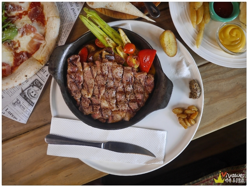▲這款安格斯極黑肋眼牛排是用碳烤的方式料理,建議點五分熟最剛好!牛排旁邊是炭烤時蔬~有茄子、櫛瓜、紅甜椒、番茄、玉米筍!白色盤子上放了海鹽、芥末籽、馬鈴薯和蒜頭做搭配!