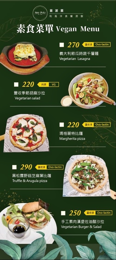 ▲因為吃素的人口越來越多,所以首波里直接特製一張素食菜單!讓吃素的朋友可以更方便點餐唷!超級貼心啦!除了沙拉是全素,其餘品項都是蛋奶素!有豐收季節胡麻沙拉、義大利節瓜時蔬千層麵、瑪格莉特比薩、黑松露野菇芝麻葉比薩、手工素肉漢堡佐油醋沙拉!