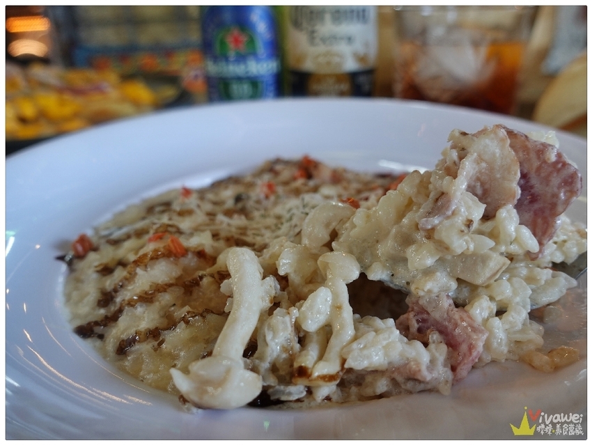 ▲這道奶油培根醋膏燉飯是店家的經典款必點品項!燉飯裡面有培根和滿滿的菇類!菇類有鴻喜菇、美白菇和杏鮑菇!而上面的黑色醋膏有解膩的作用~讓你吃完一整份奶油燉飯都不覺得膩口!