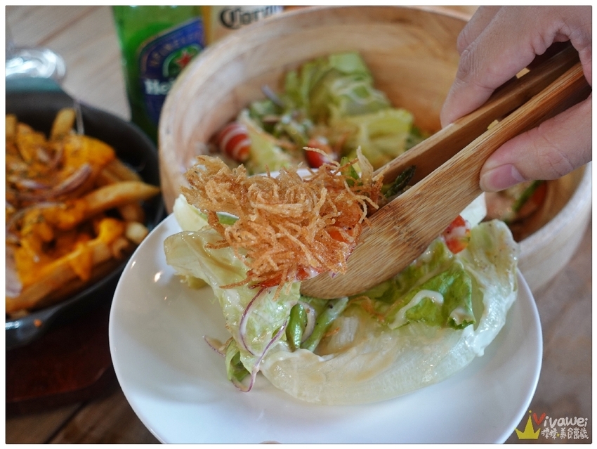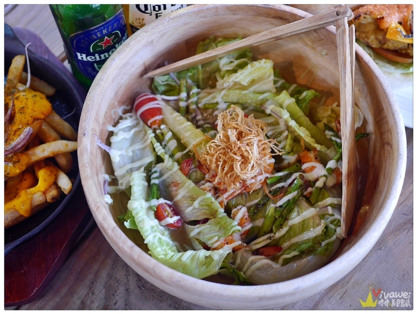 ▲這款白蝦蘆筍沙拉有五隻炭烤白蝦、炭烤蘆筍、美生蘿蔓、番茄、紫洋蔥絲、最上面加了炸馬鈴薯絲增添口感,醬料是芝麻醬和芥末美乃滋,吃起來帶有芥末的香氣,是道夠味但不膩口的清爽沙拉!