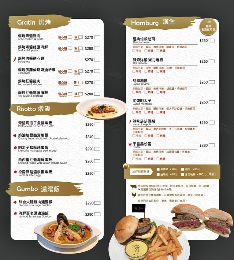▲菜單2.0上的帕里尼不見了~新菜單3.0多了漢堡!六種口味的漢堡均附薯條和香濃起司醬~還可以加價升級好料!