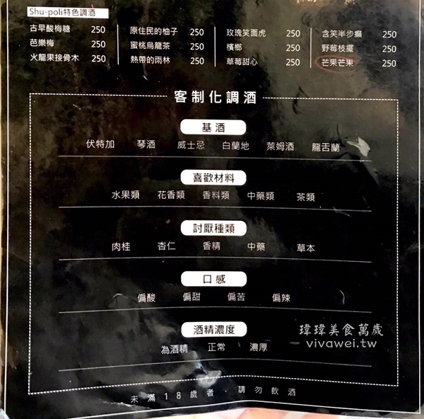 ▲除了酒單上的固定品項外,還有提供客製化調酒,可以自行選擇基酒、喜歡材料、討厭種類、口感、酒精濃度,讓調酒師調出為你客製化專屬口味(未滿18歲請勿飲酒)。