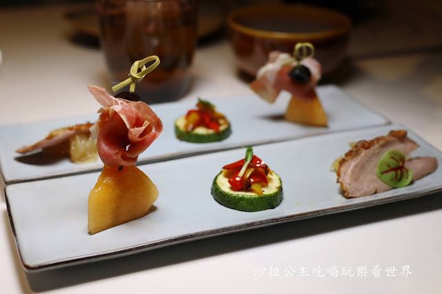 前菜分別為:炙燒鴨胸、烤櫛瓜、哈密瓜火腿