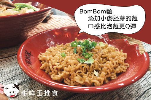 吃滷味當然要點泡麵,發現架上沒有賣市面的脆麵,但有丐幫獨創的「BomBom麵」,稍微看旁邊的介紹海報,特別添加天然小麥胚芽,感覺好像跟泡麵不一樣。吃一口下去,口感真的比市售更Q彈,更有嚼勁,當下很想問店家,有沒有單賣。
