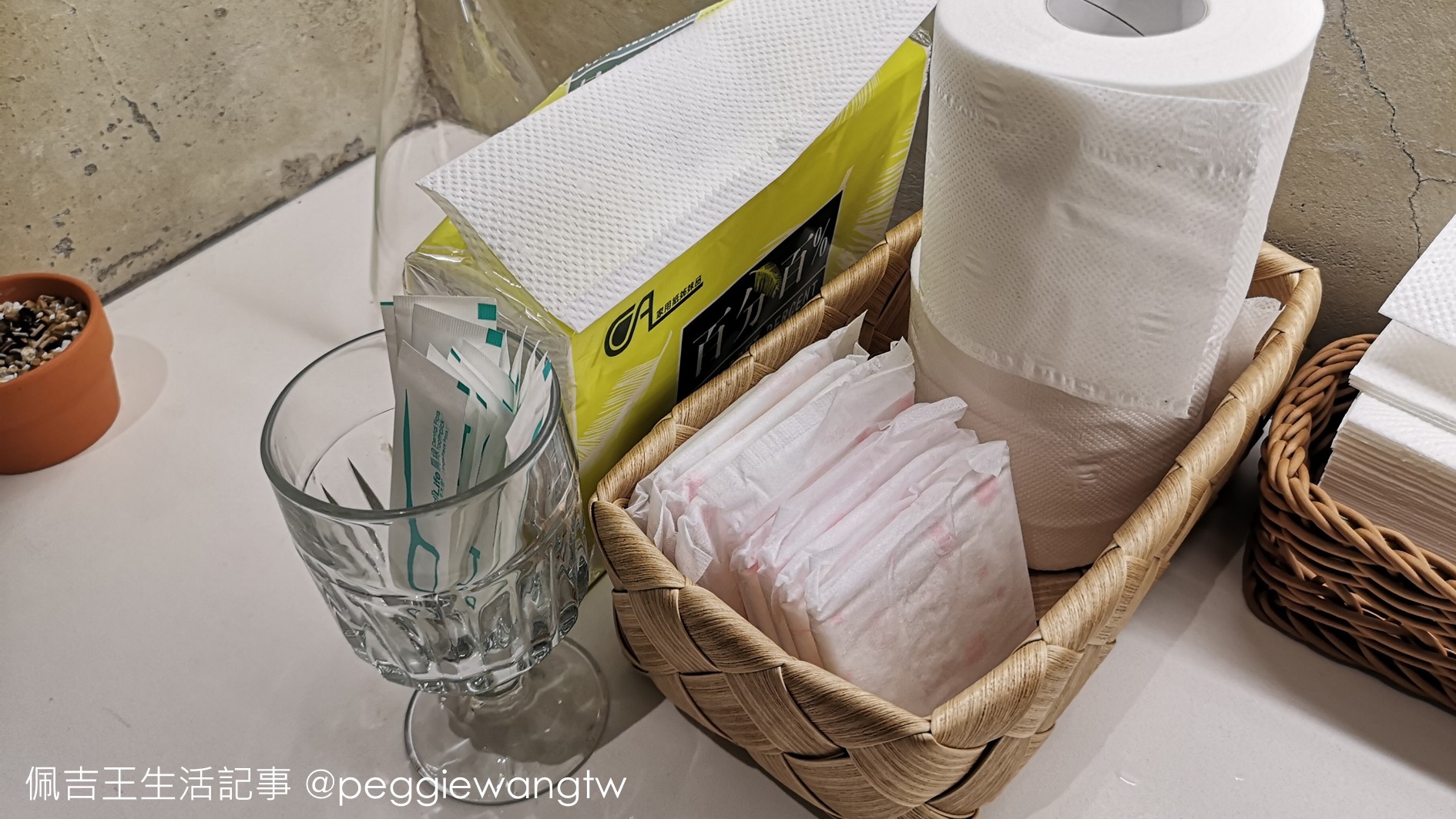 | 除了該有的擦手紙、衛生紙,還有貼心的女性衛生用品、牙線棒💯。 |