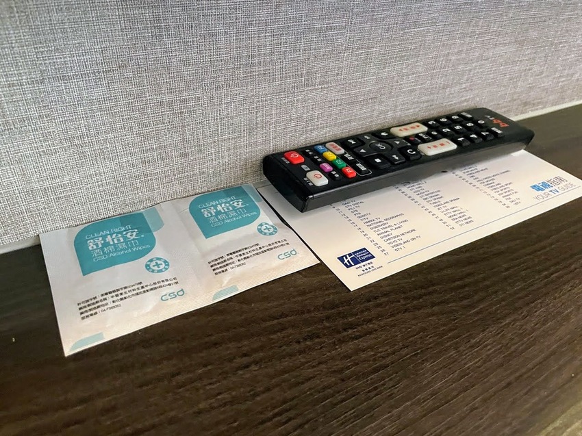 高雄愛河智選假日酒店 對於防疫要求也相當的高,遙控器旁貼心附上酒精棉片,可以供擦拭消毒使用。